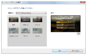 なお、ここで「編集ソフトウェアを起動する」をクリックすることで、メニューを編集できる。実行するとメニューデザインの選択ダイアログが表示され、好きなものを選択できる。それぞれBGMが異なっており、BGMを変更することはできない。なお、バックの映像はサンプルなので、実際のディスク作成時は、BDに収録されている映像が自動的にセレクトされて使われる。