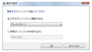 ちなみに、素材を一度、登録した後でも追加することも可能で、「できあがりイメージ確認」画面に動画ファイルをドラッグ&ドロップすれば、プレイリスト登録ダイアログが表示され、好きなプレイリストに動画を登録できる。既存プレイリストに追加することもできるし、新しいプレイリストを作成することも可能だ。