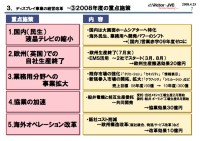 決算報告書では、「収益が悪化している液晶テレビ事業について、国内民生液晶テレビ事業の縮小」を行うと言及。販売台数は大きく減らすが、ビクターが自社開発した薄型テレビの開発、生産・販売そのものは継続し、販路をAV専門店、ビクター系列店、一部量販店などに絞り込む。国内向けテレビの生産はタイで行い、42/47V型など大型モデルを中心に、年間35,000台の販売を見込む。