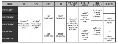 そのほかの仕様は共通で、OSにはWindows Vista Home Premium(SP1)を搭載しているほか、CPUはインテルCore 2 Duo、メモリは2GB、液晶ディスプレイは1,680×1,050ドットの21.6型ワイドとなる。Office Personal 2007も付属する。