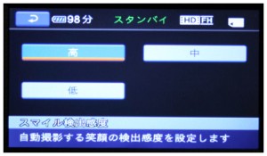 しかし電源が入っているときに、常時、笑顔を検知してシャッターが落ちてしまうというのも面倒だ。本機のスマイルシャッター機能は、必要に応じて機能のオンオフができるのは当然、感度も3段階に調節することが可能。スマイルシャッター関連の設定はホームメニューの「顔機能設定」>「スマイルシャッター」で行うことができる。