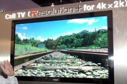 同社ブースに展示されているCELL TVのディスプレイは2つ。1つは56V型の4K2K(3,840×2,160)ディスプレイ、もう1つは55V型でバックライトに白色LEDを搭載したフルHDディスプレイだ。