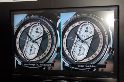 昨年のCEATECでデモが行われた超解像技術も展示。こちらは、独自の信号処理技術によって入力映像の解像度を推定し、さまざまな解像度の映像を適切に高精細化できるというもの。また、エリアごとに適応型の処理が行えるため、映像のボヤケ度合いを判定し、そこだけに超解像処理を行うことなどもできる。
