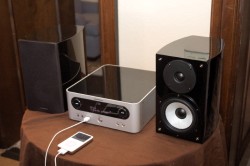 また、CDステレオアンプ「M-CR502」とスピーカー「LS702」のシステムも出展。CDステレオアンプは25Wのデジタルアンプを4基備え、2組のスピーカーを別々に鳴らしたり、バイアンプ駆動を1台で行えるのが最大の特徴。また、4隅を丸く整えたラウンドフォルムや、4mm厚のアルミを使用したスタイリッシュなデザインも評価が高い。