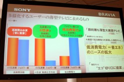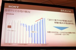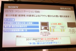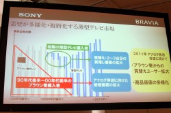 マーケティング戦略の説明では「アナログ完全停波に向けて、まだブラウン管テレビを使用しているユーザーの買い換え需要や、2000年前後に初期モデルの薄型テレビを購入したユーザーの買い換え・買い増し需要を見込んでいる」と、ターゲット層について説明。