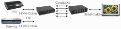 送信機と受信機の間を、5本のBNCタイプの同軸ケーブルでつなぐ。RGBに3本、クロックに1本、パワーに1本と計5本のケーブルを使用することで長距離でも安定した信号伝送を実現。1080p/8bit信号を最大100メートル伝送できるとのことだ。