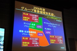 部門別では、デジタルAVCネットワーク分野の売上高は3兆4,920億円と前年度比13%の減収。このうちAV機器部門では、液晶テレビは前年比29%増収の3,385億円となったが、プラズマテレビは8%減の5,759億円の売上げにとどまった。またデジカメについても売上高が前年度比マイナス15%となった。また、カーエレクトロニクス部門も前年度比19%と減収率が高かった。