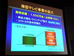 商品戦略では、「超・つながる」「超・省エネ」「徹底したユニバーサルデザイン」をキーワードに魅力ある製品を開発。デジタルAV事業については、プラズマパネルを製造する尼崎第5工場と、IPSアルファテクノロジ姫路工場への大型投資を一部抑制するものの、薄型テレビ事業の拡大を計画。NeoPDPやIPSαパネルをベースに、商品力とラインナップの強化を図る。同時にコスト低減も行うことで、販売台数を2008年度の1,005万台から2009年度は1,550万台へと、約1.5倍に伸ばすことを計画。これが達成すればシェアは12%程度になるという。なお、2009年度に販売計画している1,550万台の内訳は、プラズマが775万台、液晶が775万台と、ちょうど半分ずつとなる。