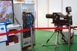 昨年技研に出展された3,300万画素のCMOSデバイス(関連ニュース)を3枚搭載したプロトタイプカラーカメラ。今年は新たにカメラコントロールユニットを試作し、フル解像度SHVの広帯域映像信号(72Gbps)を処理する。カメラヘッドとコントロールユニット間は光ケーブルで接続。フル解像度SHV映像信号と64ch音声信号を1km程度転送することが可能だという。また、コントロールユニットとテレビなどの機器間接続を容易にするべく、12芯光マルチケーブル4本で接続が可能な小型伝送モジュールも試作・展示している。