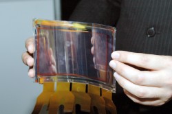 樹脂製の基板に有機TFTアレイを蒸着することで、薄型・軽量化を図り、さらに曲げるなどの取扱も可能にしたもの。フォトリソグラフィーによる電極や半導体の作製方法を改良することで、有機TFTをマトリックス状に構成した有機TFTアレイの性能や一様性を改善したという。