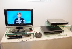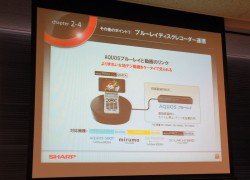 BDレコーダー“AQUOSブルーレイ”との動画リンクについては、今月発表されたNTTドコモ「SH-07A」(関連ニュース)と、BDレコーダー「BD-HDW40」(関連ニュース)との連携機能のデモが紹介された。本機能ではBDレコーダーで番組録画時にモバイル用コンテンツを自動作成し、「SH-07A」に同梱される卓上ホルダーとBDレコーダーをUSBケーブルで接続して簡単に録画番組を転送することができる。レコーダーで生成されるモバイル用コンテンツの最高解像度は640×360ドット/30fps。本体内蔵の2GBフラッシュメモリ、またはmicroSD/SDHCカードに録画番組を転送して楽しめる。BDレコーダーの対応機種はBD-HDW40/HDW35/HDW32。