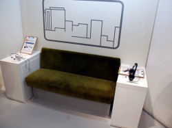 また、6月21日に発売を控えるデジタルNCヘッドホン「MDR-NC300D」と「MDR-NC600D」(関連ニュース)を発売に先駆けて体験可能なコーナーも用意。電車の長イスを模したセットに座って、擬似的に流されている電車の走行音の中で製品のノイズキャンセリング能力を試せるようになっている。