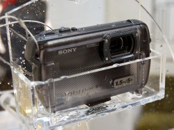 会場には、小さめの階段で繋がれた2部屋に11の展示コーナーを用意。「APK-THAB」などの防水ケースを装備した“サイバーショット”を実際に水中へ沈めるなどの“実験”ができる。