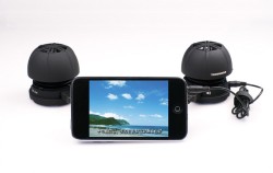 本体はコンパクトな手のひらサイズを実現。バッテリーを内蔵しており、USB経由での充電に対応しているほか、フル充電後は最大約2.5時間の連続再生が楽しめる。iPodやiPhone、ノートPCとステレオミニジャックケーブルで接続する。左右合計3.4Wの出力を実現。