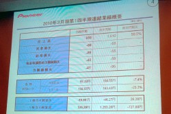 パイオニア(株)は、2009年第1四半期の連結業績発表を行った。売上高は958億円(前年同期比40.5%減収)、営業損失は88億円、経常損失は89億円。純損益は41億円。