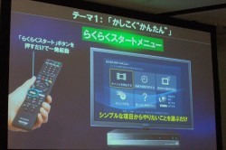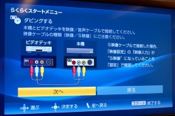 「かしこく“かんたん”」を実現する機能としては、XMB(クロスメディアバー)の代わりとなる「らくらくスタートメニュー」を全機種に設けたことが挙げられる。リモコンの専用ボタンから「らくらくスタートメニュー」を開き、予約録画やタイトル再生などを、ナビゲーションに従って行うことが可能。「基本動作をガイド機能と一緒に簡単に使え、初心者の方も安心」と高橋氏は語る。また磯村氏は「今後はVHSデッキからの買い換えユーザー増加が期待される」と説明。らくらくスタートメニューにVHSのダビングメニューも用意した。わかりづらい配線の段階から図入りで説明してくれるため、VHS資産のデジタル化をかんたんに行いたいというユーザーには注目の機能だ。