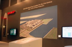 今年10月に稼働を開始する堺工場についてもアピール。「21世紀型のコンビナート」というコンセプトのもと、第10世代マザーガラスを採用し60型クラスが6枚、57V型が8枚、42V型が15枚取れる生産効率の高さを誇る同工場についての展示を行っていた。