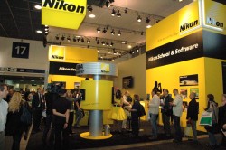 ニコンのブースには、日本でも発売されたばかりの「D3000」が早くも登場。実際に製品を手にとって試せるということもあり、ブースは押し合い圧し合いの大盛況となっている。