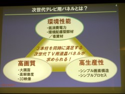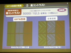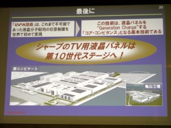 また水島常務執行役員も、「AQUOSは今年で9周年を迎えた。次世代テレビでは、低消費電力などの『環境性能』、大画面で高解像度、3Dにも対応した『高画質』、シンプルな画素構造と製造プロセスの『高生産性』の3点を同時に満足させるパネルが求められる。」とし、「これを実現し、液晶パネルを“ジェネレーション・チェンジ”させるのがUV2A。30年来、夢の技術だったものを世界で初めて実現させた。シャープの液晶はこれで大きく変わる」と自信を見せた。