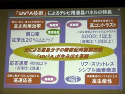 新技術のUV2Aは、高分子薄膜にUV光を照射すると高分子が照射方向に向き、液晶分子がその方向に沿って並ぶというもの。光を使って配向を行う、世界初の新技術だ。実現には、全く新しい分子構造の光配光膜材料を独自開発したことが大きく寄与したという。同社 代表取締役副社長の井淵良明氏は「液晶開発で40年の歴史を持つ当社が『液晶分子の気持ちになって考えた』技術」と説明。また同社 常務執行役員 研究開発本部長の水島繁光氏も「従来技術の課題を解決する、現在において理想的な配向技術。液晶技術者たちの30年来の夢がかなった」とその意義を強調する。