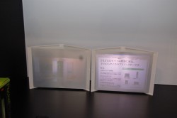 またデジタルサイネージ用途を想定した背面投射スクリーンも展示。ユーザーが任意の形に本体を切り取って使える仕様としており、スクリーン自体の形を自由に工夫してアピール性の高いデジタルサイネージを実現できる点を特徴としている。
