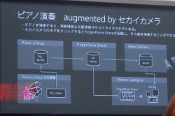 各所で話題を呼び、先月24日についてに一般頒布がスタートしたiPhone用アプリ「セカイカメラ」。iPhoneのカメラを通じて、空間にポストイットを貼るような感覚でコメントや写真、音を「エアタグ」として残せる「セカイカメラ」と、ヤマハのiPhone用アプリ「FingerPiano Share」がコラボした。FingerPiano Shareで弾いた音楽を、セカイカメラのエアタグとして投稿できるデモが行われている。
