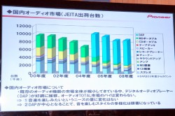 iPod用スピーカー市場も右肩上がりに成長しており、2009年度は約40万台、41億9,019億円規模の市場になると予想されている。「しかしiPod用スピーカーはコンパクトさや廉価さがフィーチャーの製品が多く、デザインや音質にこだわったモデルがなかった。そんな“ありそうでなかった”システムとしてパイオニアが発売するのが、新製品の『NAS5』だ」と自信を見せた。