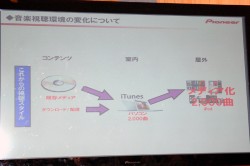 アンプやスピーカー、コンポなど既存オーディオが苦戦する現在の国内オーディオ市場だが、DAP市場は拡大を続けている。「つまり音楽を楽しみたいというニーズの量に変化はない」と説明する加藤氏。DAPが中心になることで、音楽を楽しむスタイルの多様化が顕著になっているとも話す。「DAPメモリの大容量化が進み、多くの楽曲を保存できるようになった。これまでは家ではコンポ、外ではiPodというように住み分けがされていたが、これからはiPodが一種のメディアのように機能し、屋内/屋外問わずソースにして楽しむ、というように変化してきている」(加藤氏)。