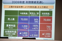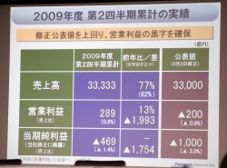 この結果に伴い、同社は2009年度通期の業績予想数値を上方修正。売上げは7兆円と前回発表を据え置いたものの、営業利益は前回予想の750億円から今回予想の1,200億円へと、大幅な利益増を予想している。
