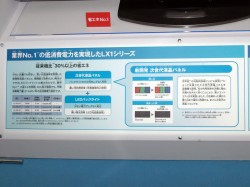 同コーナーでは、「UV2A」を採用した新パネルと白色LEDバックライトなどによって従来機比30%以上の省エネを実現したことや、キャビネットにノンハロゲン樹脂を採用するなど随所にグリーン材料を採用していることなどを解説。また、LEDバックライトの技術サンプルも併せて展示している。