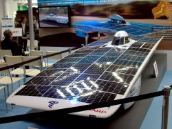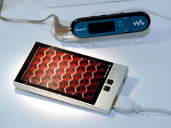 また、「色素増感太陽電池」と呼ばれる、色素を用いた太陽電池も参考出展。塗布・印刷が可能な色素を用いるため模様などをつけた太陽電池にすることができるという特徴があり、ブースには同技術を用いた窓ガラスなどを展示。模様のついた同電池を搭載したリチウムイオンバッテリーで“Walkman”を駆動させることも行っている。