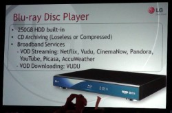 BDプレーヤーの新製品は、同日発表でBD550、BD570の2モデルを発売。BD570は250GBのHDDを内蔵し、音楽CDのアーカイブ(非圧縮、圧縮どちらも可能)が可能。BD570はIEEE802.11の無線LANを内蔵している。さらにVODサービスへの接続を行うことができ、ホームサーバー的な発想を持った製品となっている。なお、両機種ともに発売日や3D対応などの詳細は触れられなかった。
