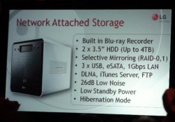 ネットワークストレージではもう一つ、時間を割いて説明が行われたのがNetwork Attached Storage、いわゆるNAS機能を備えたBDレコーダーだ。BDドライブ内蔵に3.5インチのHDDを2基内蔵、RAIDにも対応しているほか、USBなど外部接続端子も備え、DLNA、iTunes、FTPにも対応している。BDレコーダー機能を持つ他に例のない製品だけに注目だ。