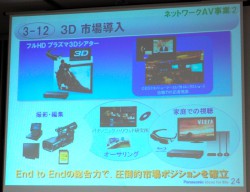 AV機器については、3D関連機器に大きな期待を寄せている。3DテレビやBDプレーヤー/レコーダー、シアターシステムなどだけでなく、パナソニックハリウッド研究所のオーサリング技術、業務用の撮影・編集機器などについても3D化を進め、「エンド・トゥ−・エンドの総合力で圧倒的市場ポジションを確立する」とした。