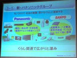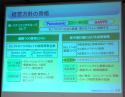 大坪社長は冒頭、三洋電機を子会社化したことについて言及。「新生パナソニックでは、三洋電機を新たにグループに加えた。特に太陽電池や二次電池、業務用機器など強い事業を持つ三洋電機を加えたことで大きなポテンシャルを得た。モノ作りで社会の発展・豊かなくらしに貢献するという方針で進んでいく」とし、三洋電機とのシナジー創出がグループの大きな課題であることを説明した。