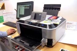 また、iPhoneやiPod TouchとWiFIで通信して写真をプリントできるプリンター「PIXUS MP990」「PIXUS MP640」なども展示されている。こちらの機能はAppStoreから専用アプリ(無料)をダウンロードして使用。プリントしたい写真を簡単に選択し、プリントサイズや印刷紙の種類まで選んでプリントすることが可能だ。