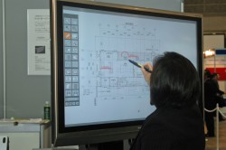 ブースには専用のフィルムを表面に貼ったディスプレイとボードが用意され、それぞれにPC内のプレゼンデータを出力。デジタルペンを通じて、紙、ディスプレイ、ホワイトボードの書き込みが同期する様子を体験することができる。複数同時アクセスにも対応しているほか、遠隔地間での操作にも対応しているという。