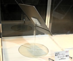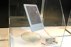 FLEpiaは現在約10万円で販売しているが、同社担当者は「Kindleの価格は3〜4万円、iPadはWi-Fiモデルで5万円前後。今後は我々も低価格化を考えなければならない。薄くて軽量、長時間駆動といった持ち運びに便利な電子ペーパーの特長を訴求し、これらのデバイスとの差別化を図っていく」とFLEpiaの目指すべき方向性を語る。この言葉の通り、ブースには薄型化を図ったFLEpia試作機も展示されていた。