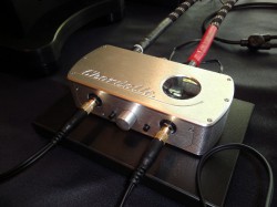 フォステクスは、現在開発中というiPod/iPhone用ヘッドホンアンプを参考出展。ドック端子を備え、ケースを閉じるとiPod/iPhoneと一体化できるものと、USB端子でiPod/iPhoneと接続するものの2種類が展示され、どちらか片方を商品化するという。なお、ヘッドホンアンプとiPod/iPhoneはデジタル接続を採用している。ちなみに同社説明員によると、圧倒的に人気が高いのは一体化するドッキングタイプとのことだが、「ドック端子によるiPodデジタル接続はアップルの認証が下りにくい。認証が取れなければUSB接続にせざるを得ない」という。