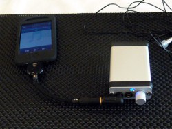 そして、小型オーディオアンプ「DA-1」にヘッドホンアンプを追加した「DA-1h」を参考出展。同製品の出力は10W+10Wで、12VのDC電源で駆動。ポータブル電源も使用可能。ブースでは実際に試聴できるようにもなっていた。