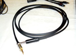 関口機械販売のブースでは、開発中のヘッドホンケーブルを参考展示。ヘッドホン付属の通常ケーブルとの比較視聴ができるようになっている。