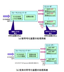 今回開発した装置は、毎秒60フレームの処理が可能なAVC/H.264方式HDTV符号化ユニット8台から構成されており、スーパーハイビジョン信号の時間方向の分割が不要で、符号化効率を高めることが可能になる。さらにデュアルグリーン方式の画素構造をHDTV符号化ユニットに適した構造に変換する処理を行うことで、符号化による画質劣化も抑制できるようになった。
