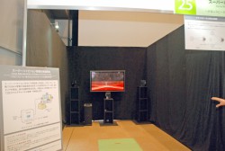 SHVの22.2chマルチチャンネル音響を3.1chまたは8.1ch環境で再現するデモを実施している。家庭で少ないスピーカー数でも22.2chと同様の臨場感を体感できることを目的に研究している。試聴エリアを想定し、音の伝搬特性を計算して、本来の音の聞こえを再現する。
