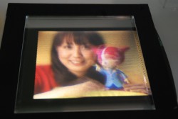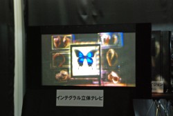 裸眼で3D立体映像を表示するインテグラル方式テレビも展示。SHV技術を応用し、解像度400×250ドットの3D映像を楽しむことができる。インテグラル方式の複数の微小レンズを並べた特殊なレンズアレーを、被写体を撮影するカメラ側、表示するプロジェクター側それぞれに装着することで立体映像を表示させる。レンズの精度や投射画像の歪補正などにより昨年より画質を向上させているという。特殊なメガネも不要で、全方向に視差があり、見る位置に応じた立体像を得られること、2視差の3D方式と比べて疲れにくいことなどからテレビ放送に最適な方式だとNHKでは考えているという。