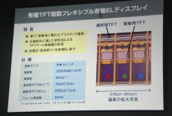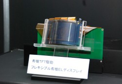樹脂製の基板に有機TFTアレイを蒸着することで薄型・軽量化を図り、フレキシブルに持ち運びができる有機ELディスプレイ。今年は画素数が320×240ドット(QVGA)と昨年展示したものから4倍向上し、より映像が精細になっている。サイズは5インチ。