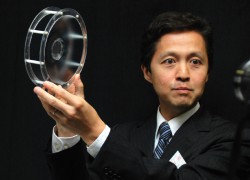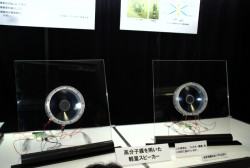 SHV用22.2マルチチャンネルを一般家庭へ導入することを目指して開発された小型・軽量スピーカーも試聴することができる。技研がフォスター電機と共同で開発しているもので、電圧をかけることで電極間に引力が働き変形する「電場駆動型エラストマー」というゴム状の素材を使用した、プッシュプル型のスピーカーだ。展示されていたスピーカーは直径16cm、膜厚100ミクロン、重さ60gという超軽量を実現。再生周波数帯域は80Hz〜15kHz。壁掛けしたり天井からぶら下げたりと柔軟な設置が可能で、家庭へ導入しやすくなっている。