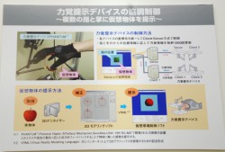 触るだけで表示されている映像ががどんなものかわかるように開発されたのが、視覚情報がなくても物体の形状や堅さなどを伝えることができる力覚提示手法だ。複数の力覚提示デバイスを制御することで仮想的に作成した物体を複数の指と手のひらで接察することができる。