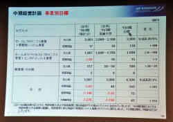 また中期戦略として、収益基盤の再構築と早期の配当開始を宣言。「強い事業に集中し、統合効果と新興市場での収益ある成長」を目指すとし、カーエレクトロニクス事業と業務用システム事業の合算で、売上げ構成比を経営統合時の40%から60%へ引き上げていく方針が示された。営業利益は130億円を目指す。