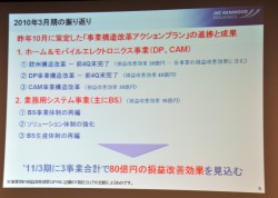 はじめに2010年3月期までに同社が行ってきた事業構造改革に関する進捗と成果に関する概要が報告された。前期を振り返ってコメントした河原氏は「カーエレクトロニクスや無線機器の分野を収益基盤としながら、ホーム・モバイルエレクトロニクス事業の損益改善、業務用システム事業の強化を図るなど、事業構造改革アクションプランを着実に実行したことで、3つの事業合計で80億円の損益改善効果を見込めるまでに達した。既に決算発表の際にご報告した通り、通期で営業黒字の業績予想を見込めるまでに至っている」と述べた。