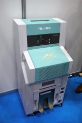 フジフイルムは、3D写真用プリンター「DPR-1」を出展している。こちらは同社の3Dデジタルカメラ「FinePix REAL 3D W1」などで撮影した画像をレンチキュラーシートに直接プリントできるシステム。現在も3Dプリントサービスを行っている同社だが、プリンターはごく限られた台数しかなかったという。「DPR-1」は451W×904H×415Dmmとコンパクト化。観光地やテーマパーク、イベント会場などさまざまな場所での3Dプリントサービス展開を目指す。